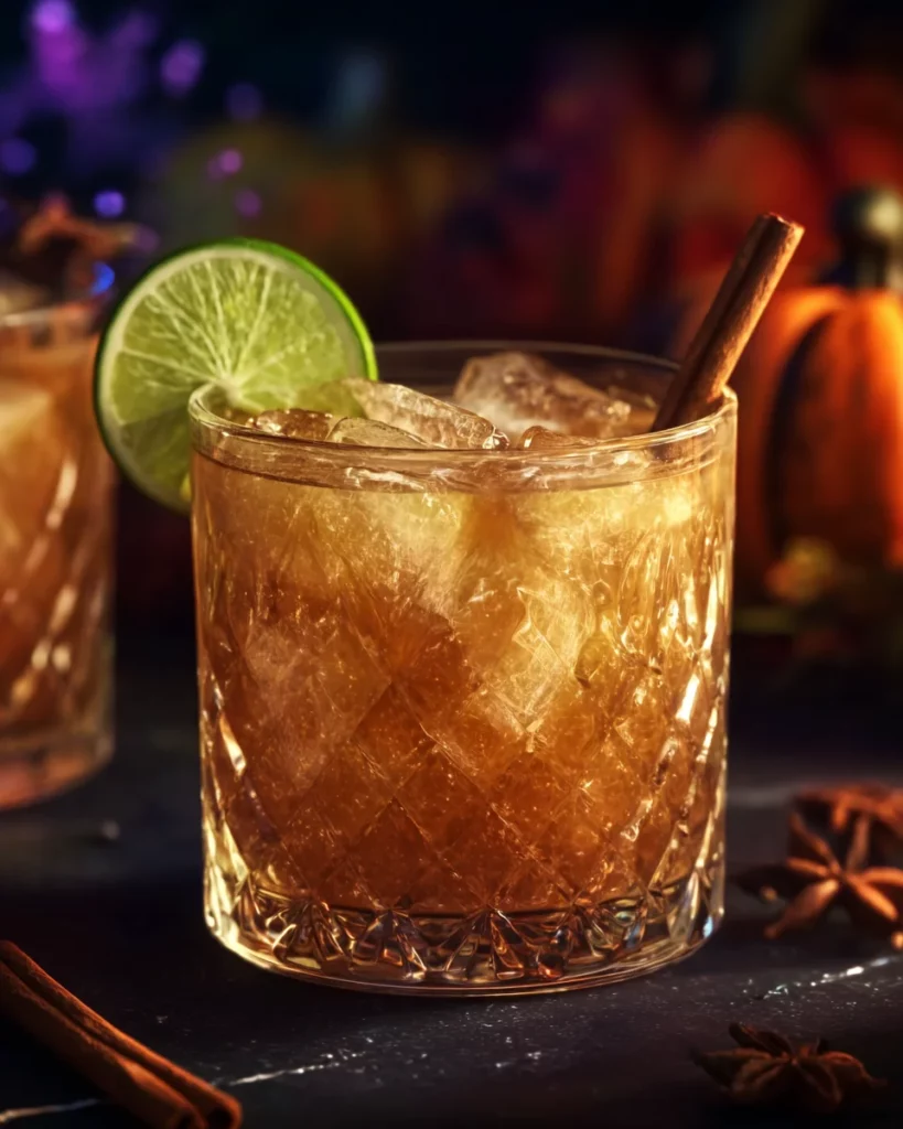 - Stir gently and garnish with a cinnamon stick and lime wedge.