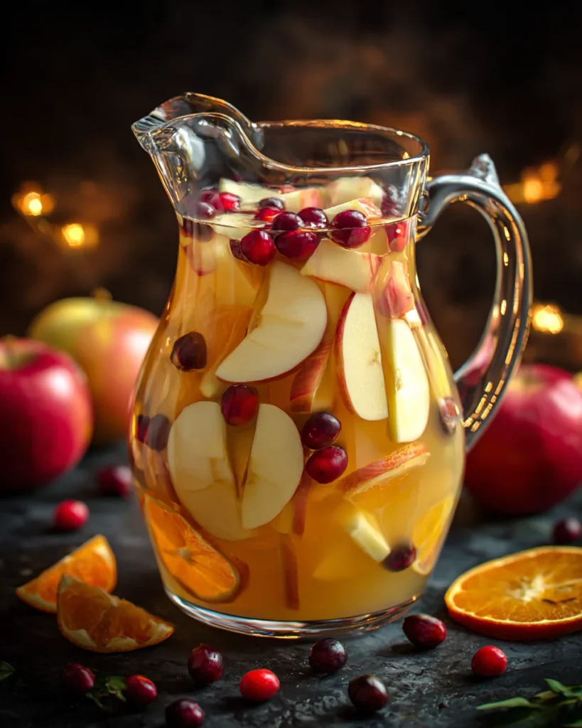 - In a large pitcher, combine apple cider, white wine, brandy, and orange liqueur.