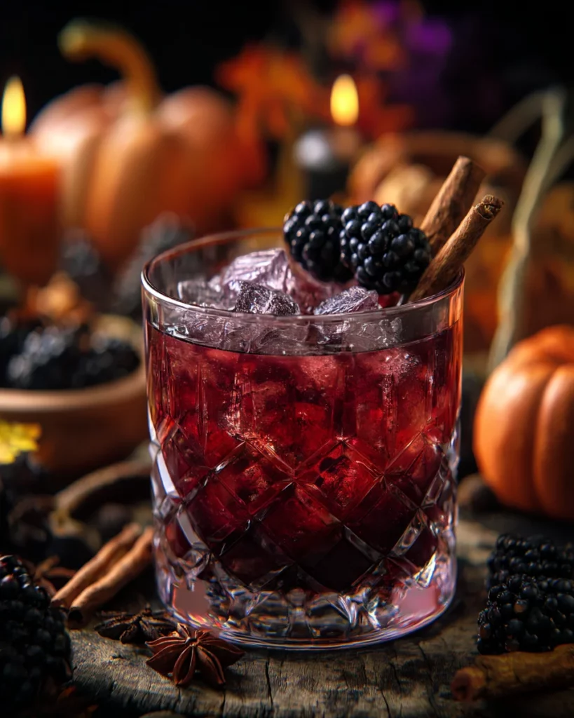 - In a shaker, combine apple cider, dark rum, blackberry liqueur, and lemon juice with ice.