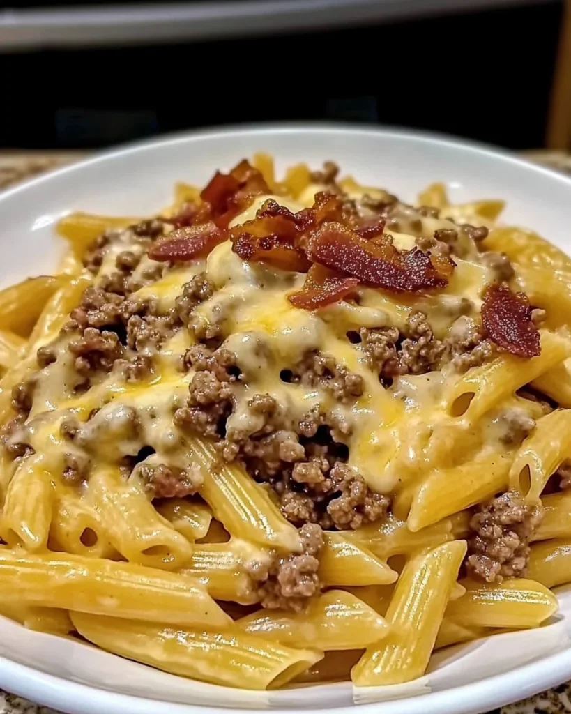Loaded Bacon Cheeseburger Alfredo Pasta is exactly what it sounds like: a mouthwatering mash-up of your favorite fast food burger and creamy, cheesy alfredo pasta. Juicy ground beef, crispy bacon, gooey cheddar and Parmesan cheeses, and a silky garlic-kissed cream sauce all wrapped around tender pasta. It’s hearty, comforting, and dangerously good.