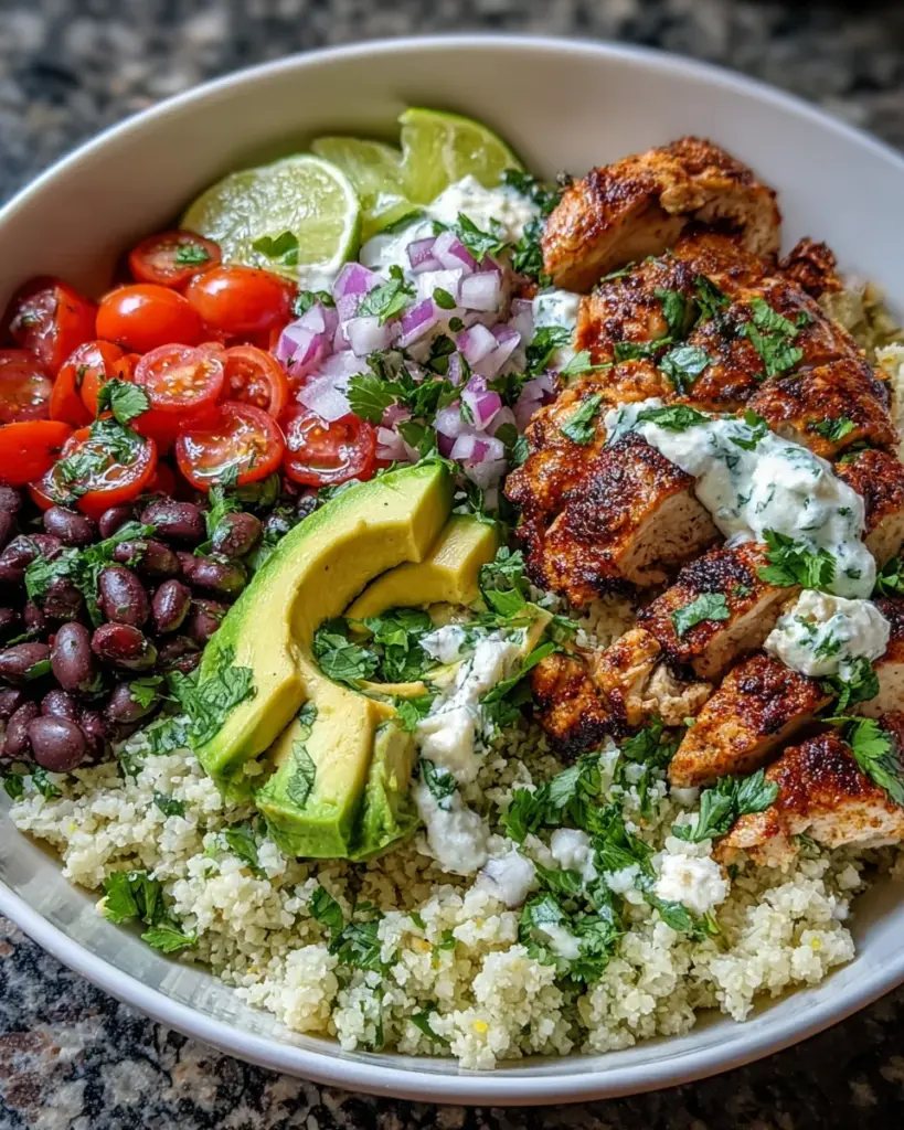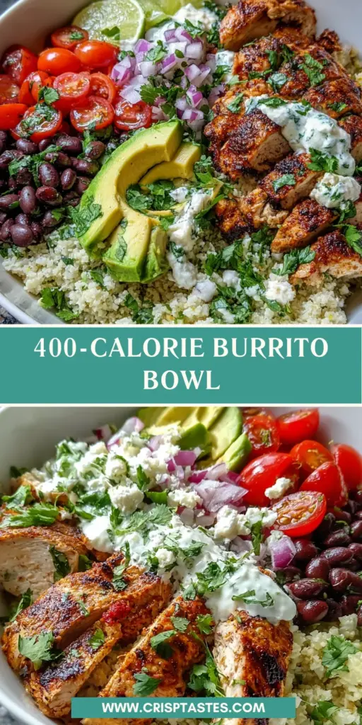 A healthy and delicious 400-calorie burrito bowl made with cauliflower rice, seasoned chicken, and fresh toppings.