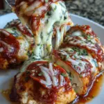 Transfer the skillet to your preheated oven. Spoon the remaining marinara over each stuffed chicken breast, and sprinkle with leftover mozzarella and all the Parmesan cheese. Bake for 15 to 18 minutes or until the chicken reaches 165°F, looking golden and bubbly. Your kitchen will be filled with the mouthwatering aroma!