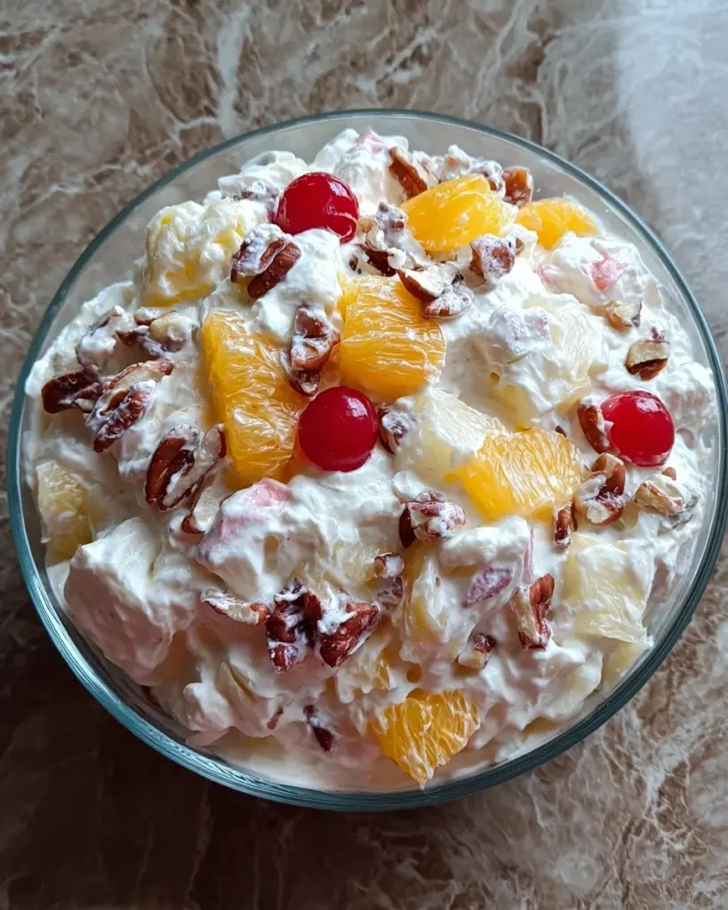 Now it’s time to jazz things up! Add the chopped pecans, mandarin oranges, crushed pineapple, maraschino cherries, coconut flakes, and mini marshmallows to your creamy mixture. Use a spatula to stir gently, ensuring every ingredient finds its place in this heavenly mix. The colors will dance together, creating a visually stunning treat!