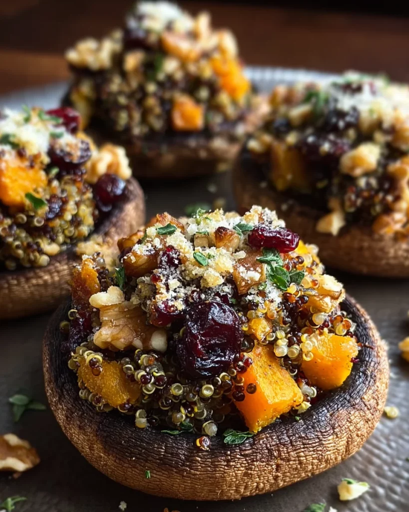 A delicious and nutritious dish made with portobello mushrooms stuffed with quinoa, butternut squash, cranberries, and walnuts, topped with Parmesan cheese.