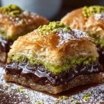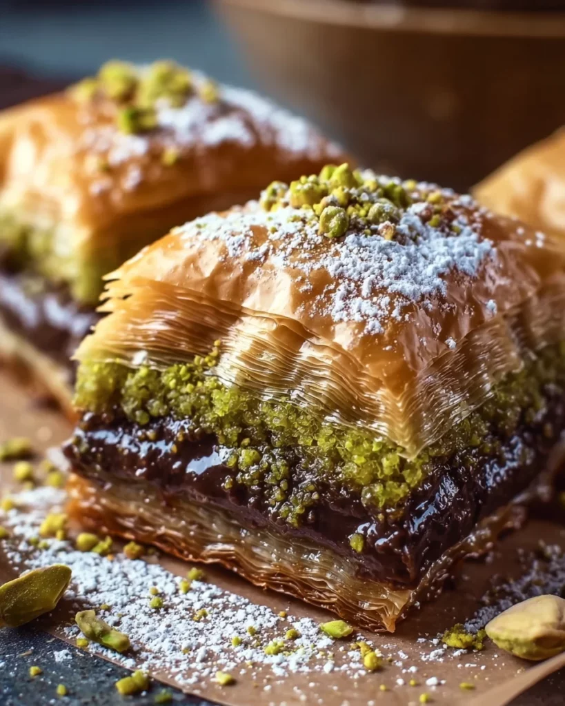 A pastry that crackles and melts with every bite, featuring layers of phyllo dough, pistachio cream, and chocolate ganache.