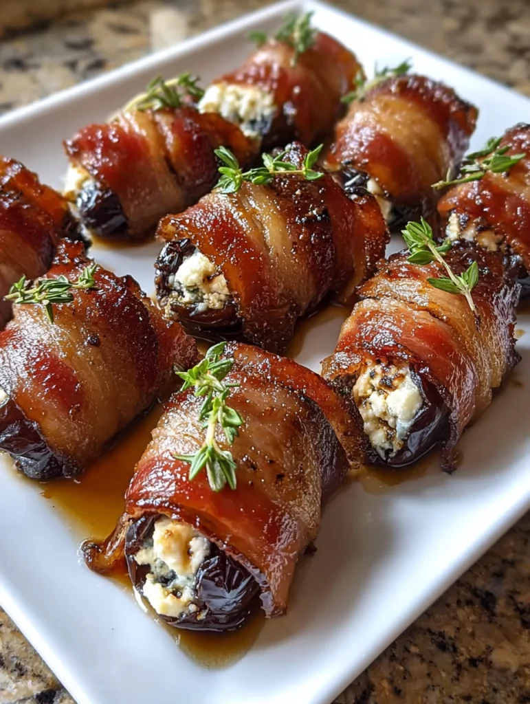 Bacon Wrapped Dates stuffed with creamy goat cheese, offering a sweet and savory bite, perfect as an appetizer.