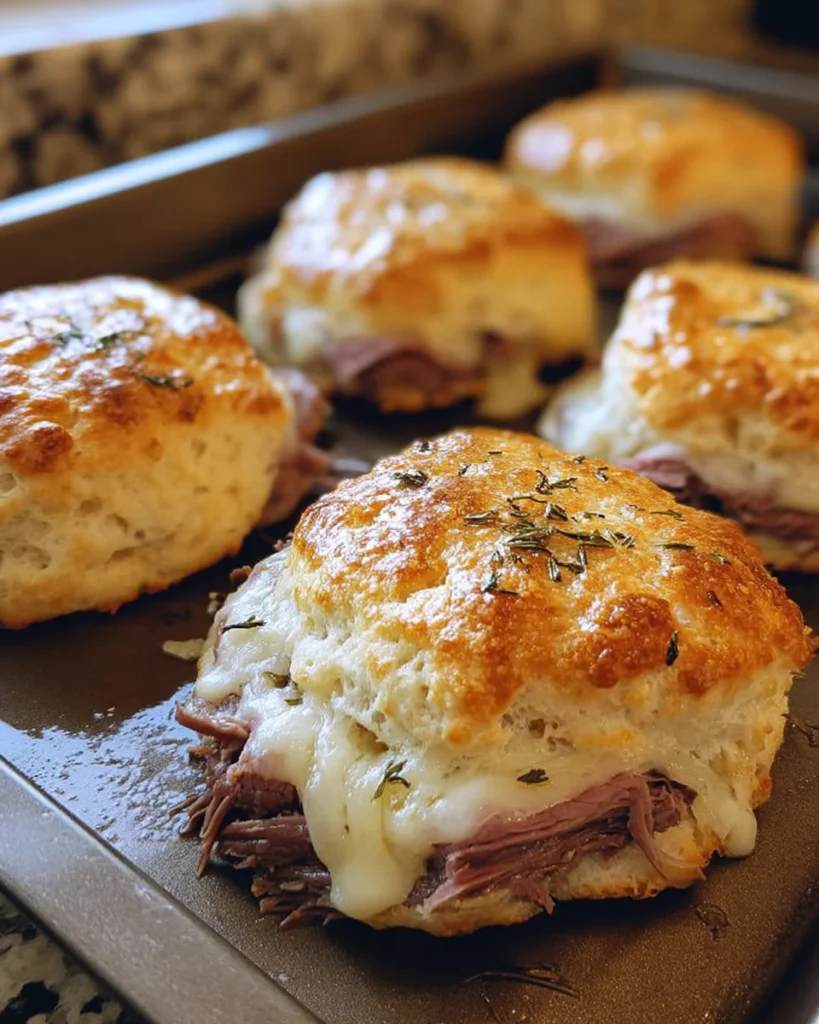 Baked French Dip Biscuits are a delicious twist on the classic French dip sandwich, featuring savory roast beef and provolone cheese wrapped in golden, flaky biscuits.