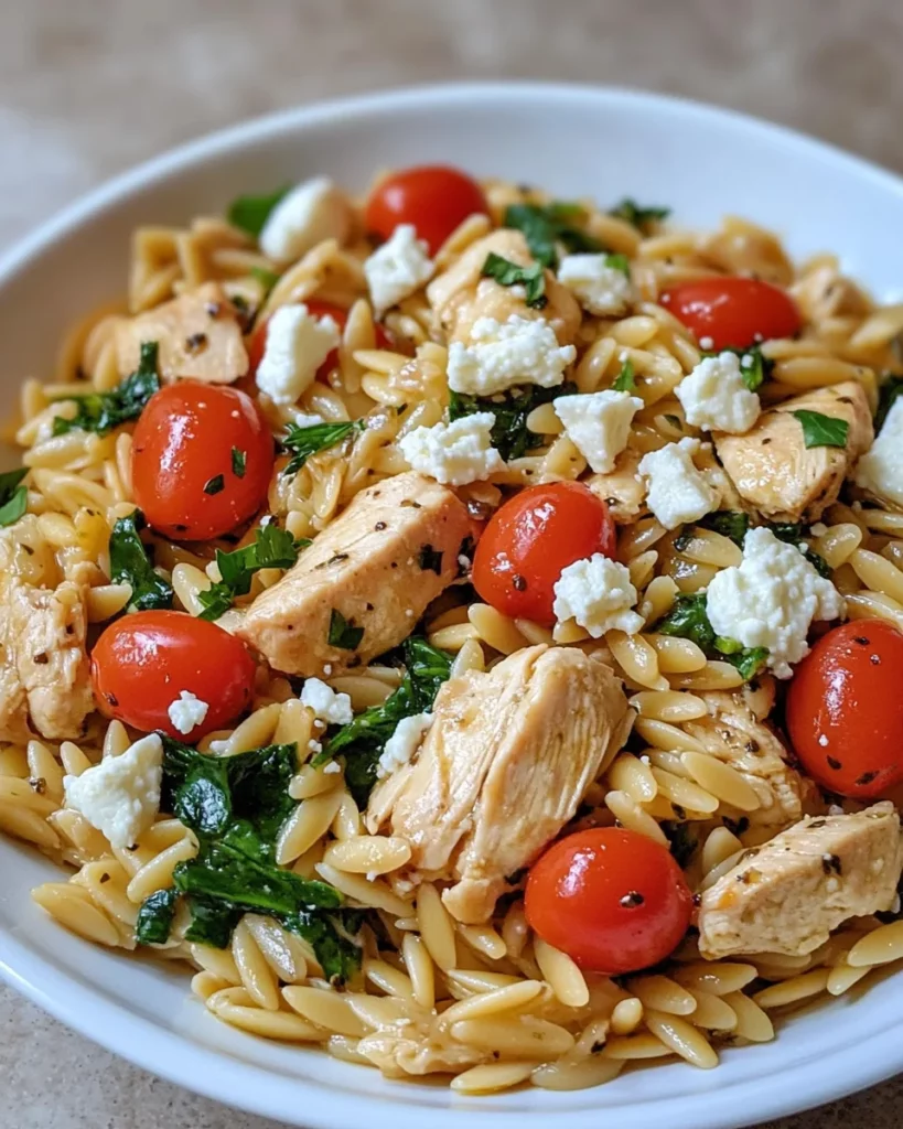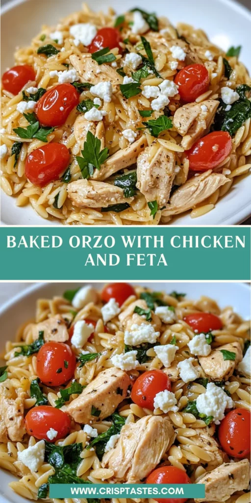 A creamy baked orzo dish featuring tender chicken and tangy feta cheese, perfect for a comforting meal.