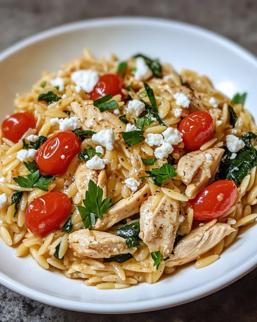 A creamy baked orzo dish featuring tender chicken and tangy feta cheese, perfect for a comforting meal.