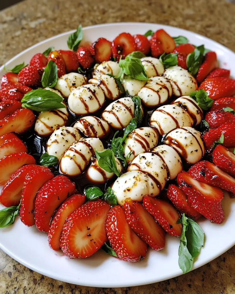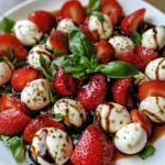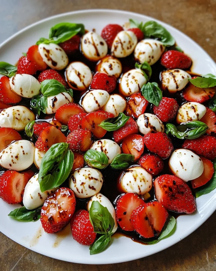 Balsamic Strawberry Caprese is a fresh and delightful salad combining ripe strawberries, creamy mozzarella, and aromatic basil, drizzled with a sweet balsamic glaze.