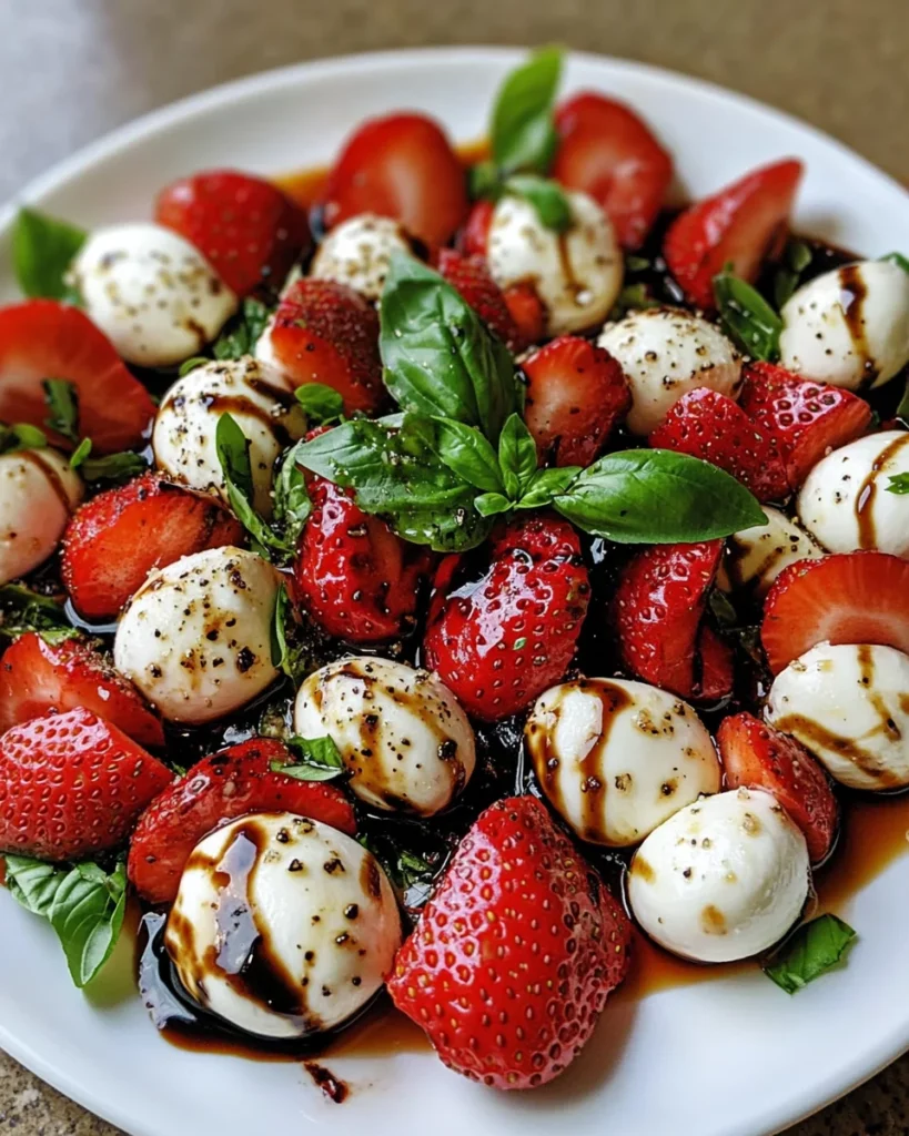 Balsamic Strawberry Caprese is a fresh and delightful salad combining ripe strawberries, creamy mozzarella, and aromatic basil, drizzled with a sweet balsamic glaze.