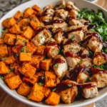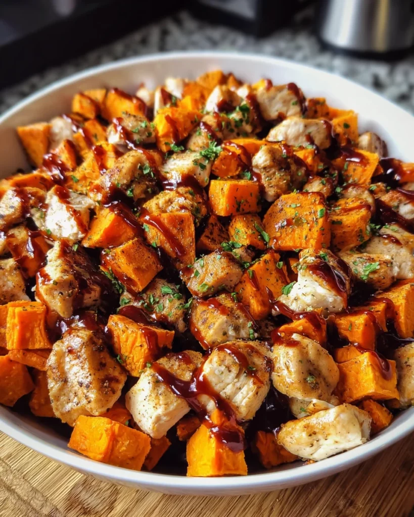 A delicious and nutritious BBQ Chicken Sweet Potato Bowl, combining roasted sweet potatoes and tender BBQ chicken for a satisfying meal.