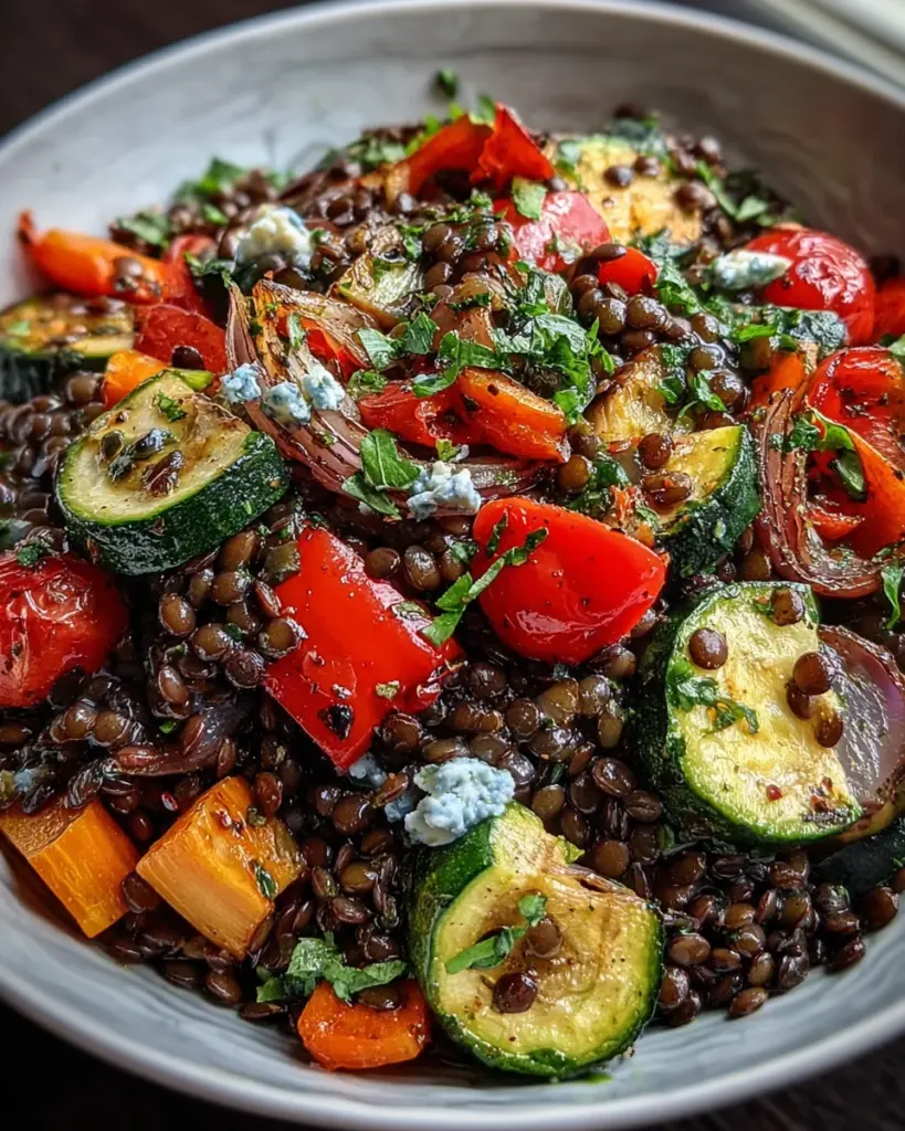 A delicious Black Lentil Salad with Roasted Vegetables, perfect for a wholesome meal.
