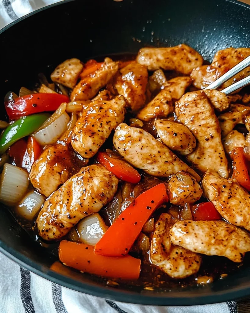 A flavorful stir-fry dish featuring chicken coated in a savory black pepper sauce, perfect for a quick weeknight dinner.