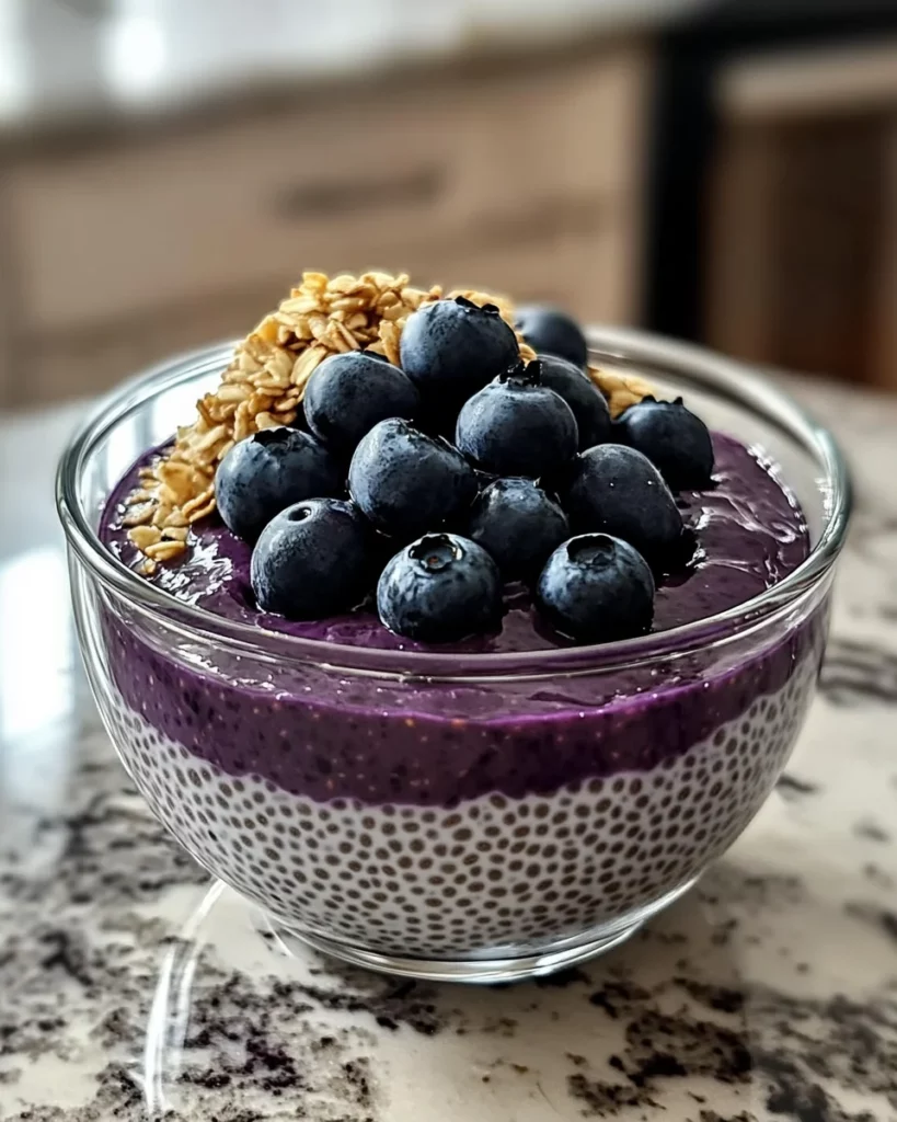 A delicious and healthy dessert made with chia seeds and blueberries, perfect for breakfast or a sweet treat.