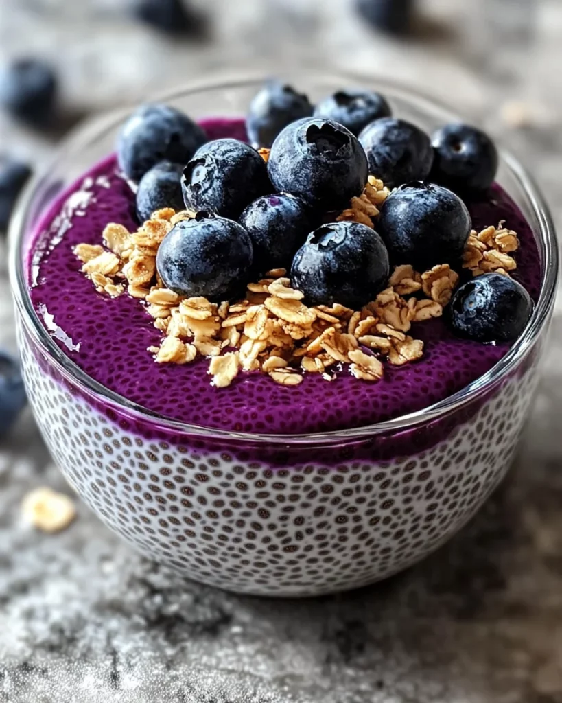 A delightful and healthy pudding made with chia seeds and fresh blueberries, perfect for dessert or breakfast.