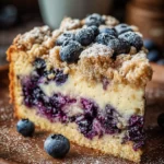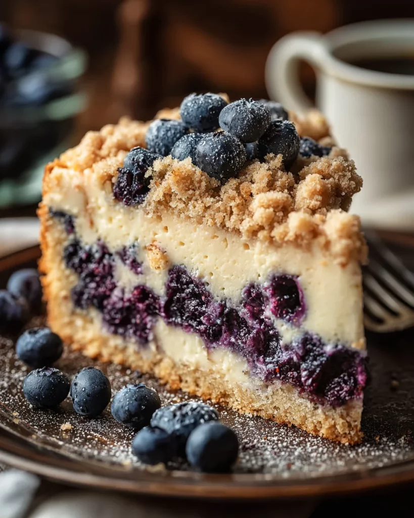 A delicious and moist coffee cake with a rich sour cream base and a burst of fresh blueberries, topped with a crunchy streusel.