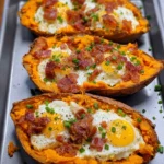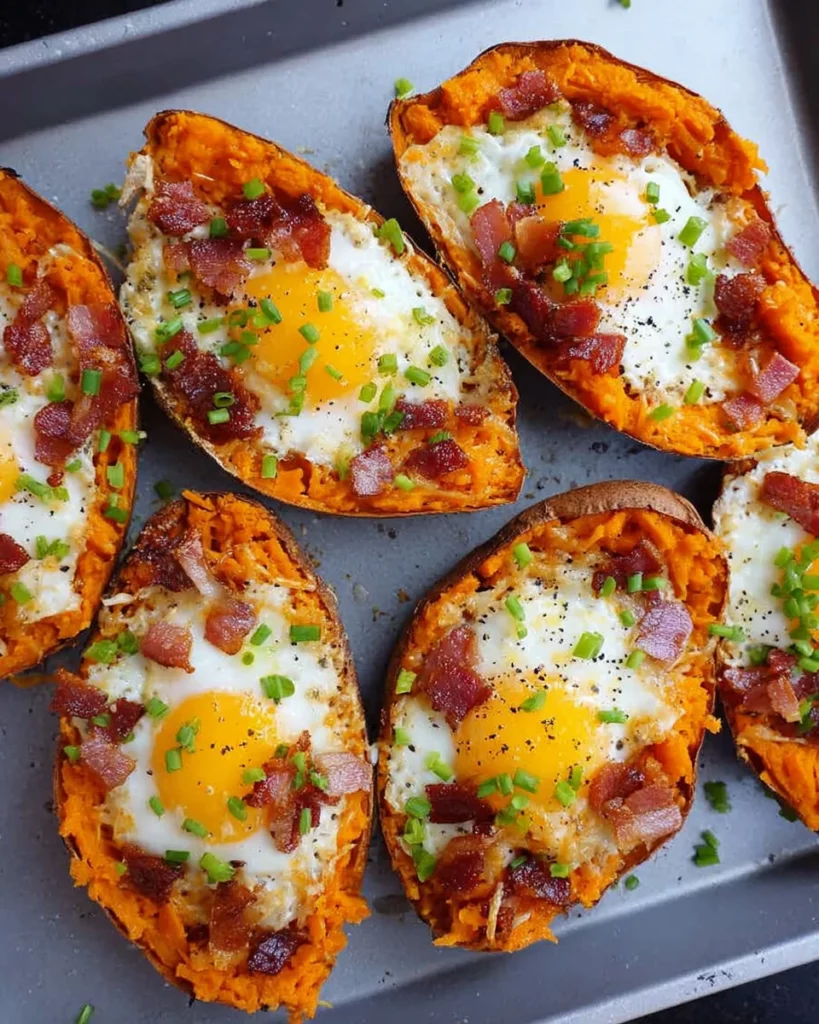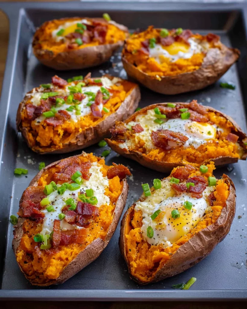 A delicious breakfast recipe featuring baked sweet potatoes filled with bacon, cheese, and eggs for a hearty morning meal.