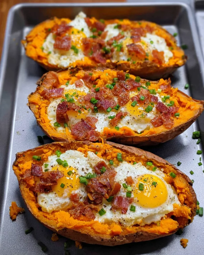 A delicious breakfast recipe featuring baked sweet potatoes filled with bacon, cheese, and eggs for a hearty morning meal.