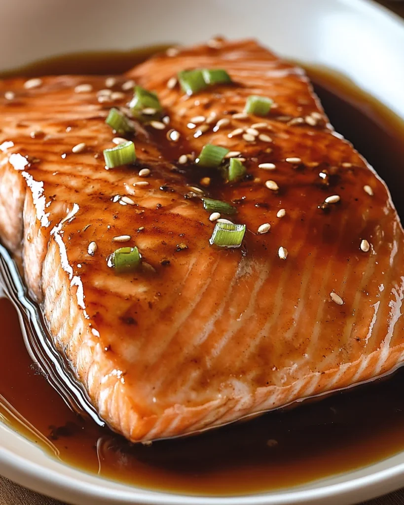 - Place the salmon fillets in a baking dish and pour the marinade over them, ensuring they are well coated.