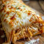 The result is a warm, cheesy, slightly spicy bake that tastes similar to a buffalo chicken stromboli or stuffed bread. Each slice reveals layers of flavorful chicken and gooey cheese that stretch beautifully when pulled apart.