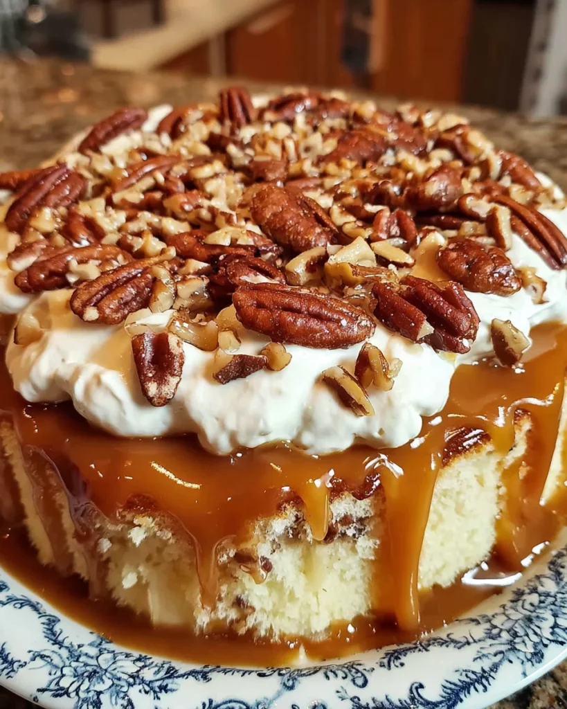 Once your cake has cooled completely, spread that glorious whipped cream over the top. Let it cover all that delicious praline sauce we poured earlier, like a cozy blanket. Drizzle the remaining praline sauce on top and sprinkle with toasted pecans. Seriously, this could be the most beautiful cake you’ve ever laid your eyes on!
