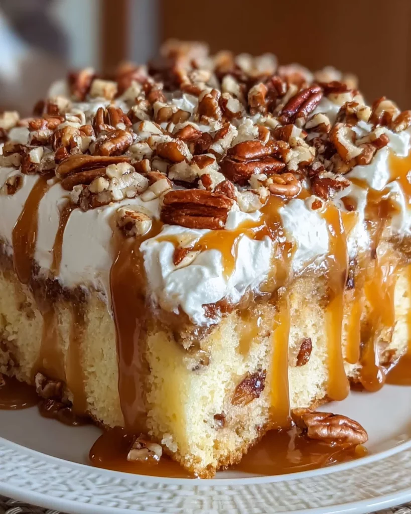 A delicious and indulgent Butter Pecan Praline Poke Cake topped with whipped cream and praline sauce.