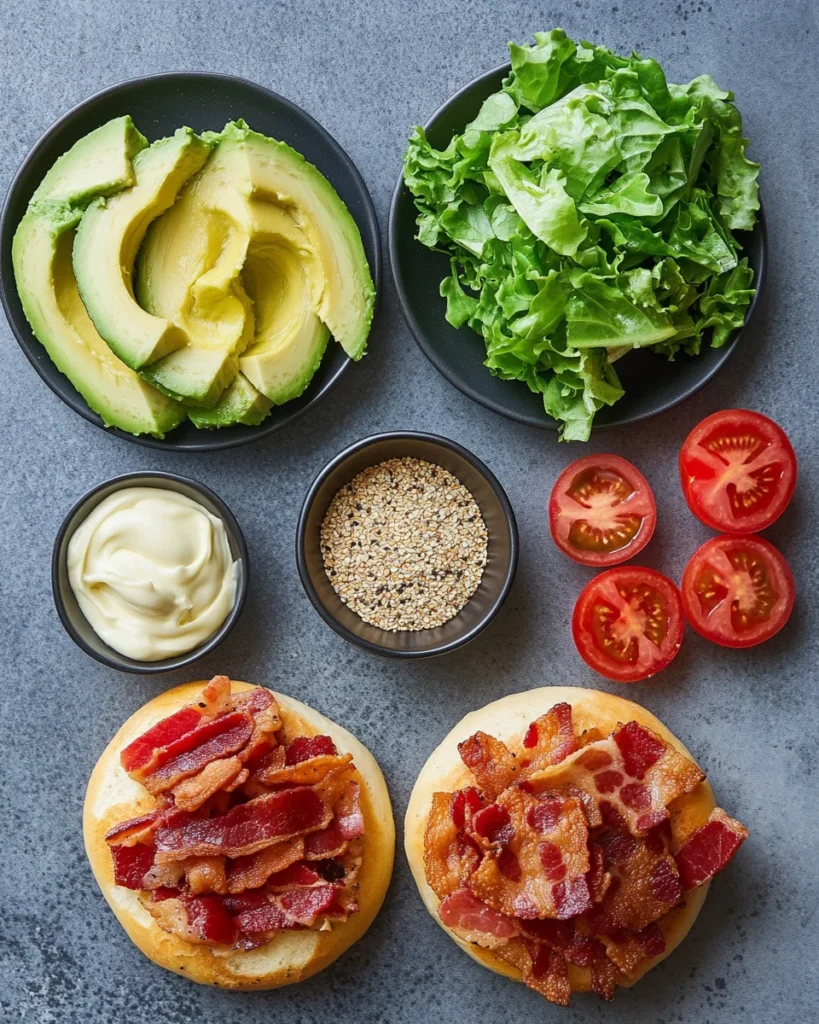 - Assemble the bagel by spreading mayonnaise and Dijon mustard, then layering lettuce, tomato, avocado, and bacon.