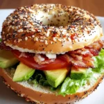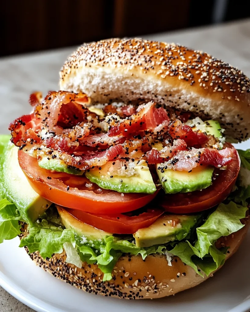A delightful twist on the classic BLT, combining crispy bacon, creamy avocado, and fresh vegetables on a chewy bagel.