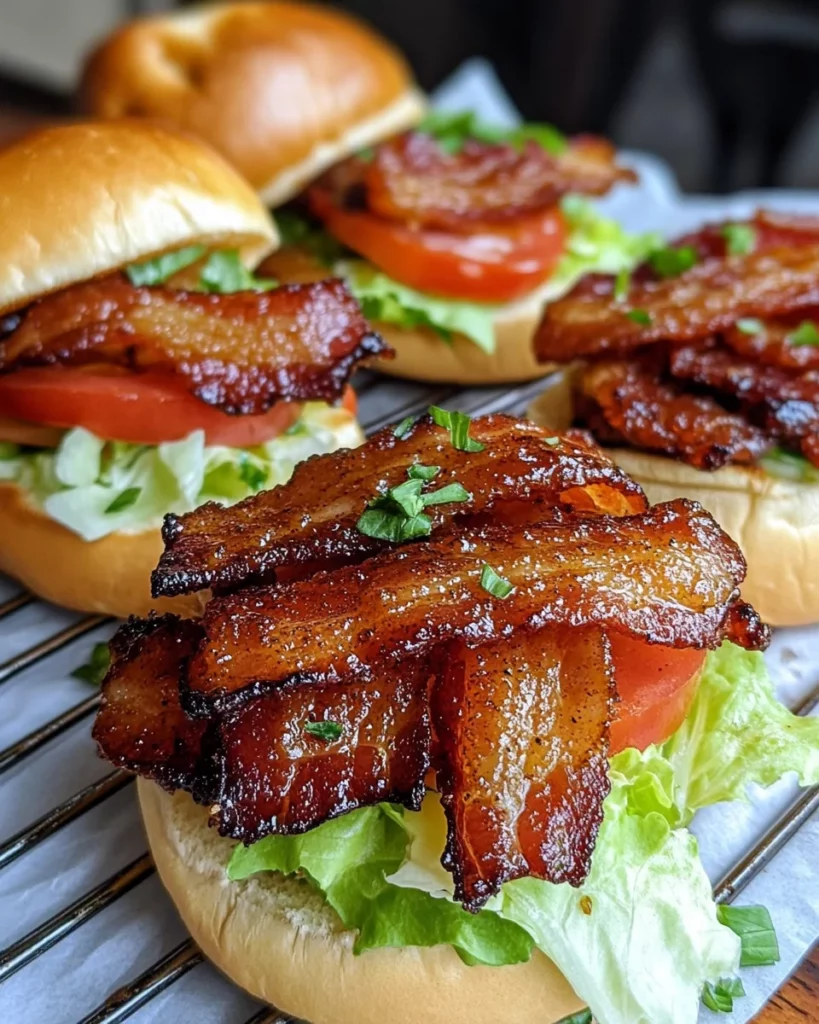 Candied Bacon BLT Sliders are an irresistible combination of sweet, salty, and savory flavors packed into a bite-sized treat, perfect for any gathering.