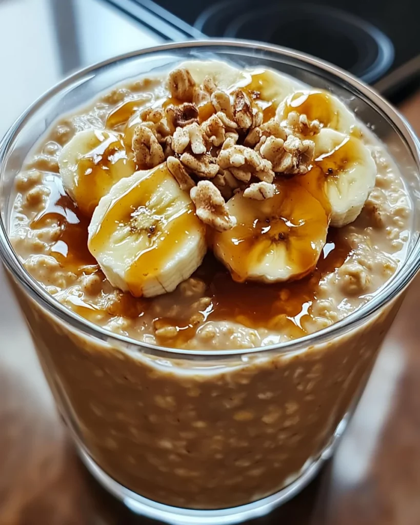 The moment of joy arrives! In the morning, give the oats a good stir. If they seem a bit thick, add a splash of milk to reach your desired creaminess. Now, transfer them to bowls and top with sliced banana, a sprinkle of chopped walnuts or pecans, and maybe even a drizzle of maple syrup if you’re feeling fancy. Enjoy each spoonful of this heavenly breakfast!