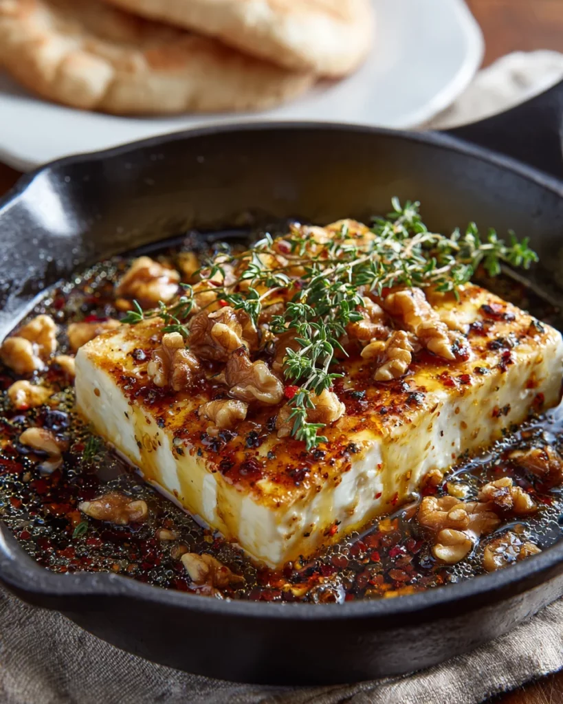 A golden, skillet-seared block of feta bathed in a lemony chili-honey glaze and topped with toasted walnuts. This dish is the perfect balance of sweet, spicy, salty, creamy, and crunchy. Serve it bubbling straight from the pan with warm bread for an unforgettable appetizer.