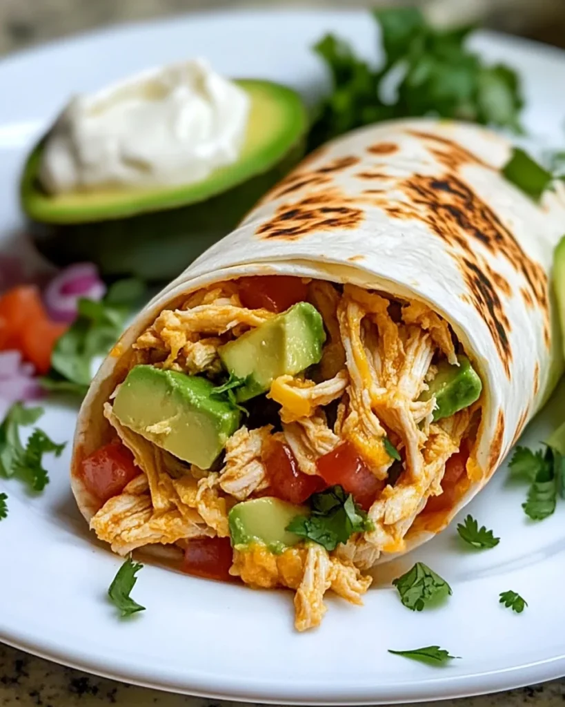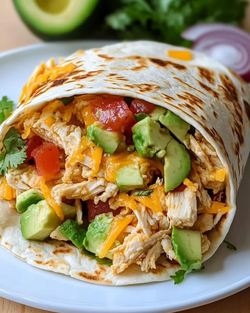 A delicious and quick meal featuring shredded chicken, creamy avocado, and melted cheese wrapped in a tortilla.