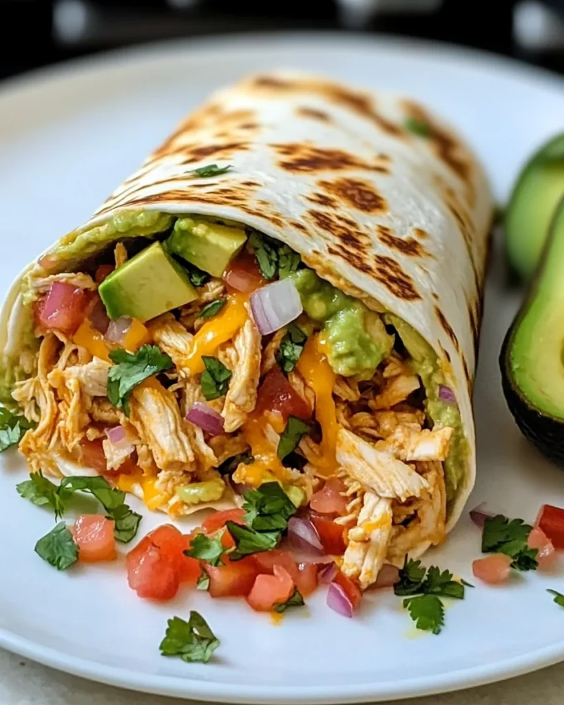 A delicious and quick meal featuring shredded chicken, creamy avocado, and melted cheese wrapped in a tortilla.