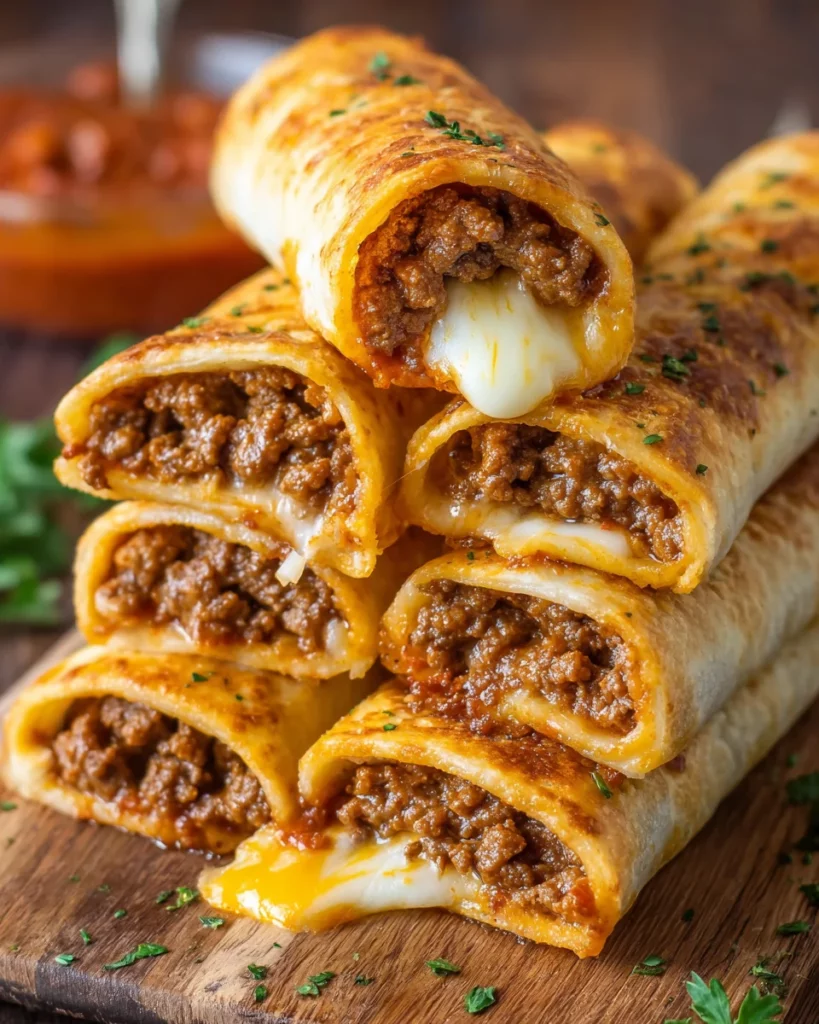 Cheesy Taco Sticks offer a delicious twist on traditional tacos, combining seasoned ground beef and gooey cheese in a convenient stick form.