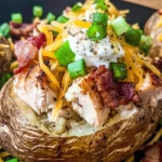 Chicken Bacon Ranch Baked Potatoes are a delicious and hearty dish that combines the flavors of grilled chicken, crispy bacon, and ranch dressing over fluffy baked potatoes.
