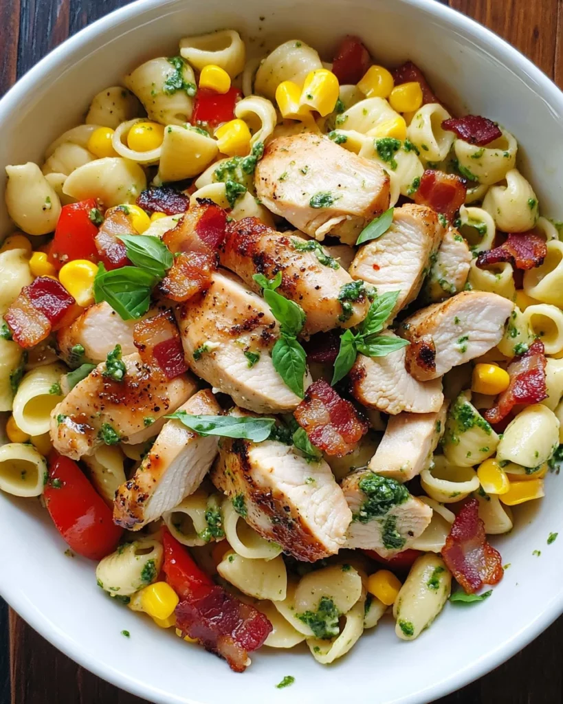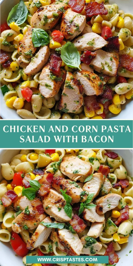 A delicious Chicken and Corn Pasta Salad with Bacon that combines tender chicken, sweet corn, and crispy bacon for a flavorful dish.