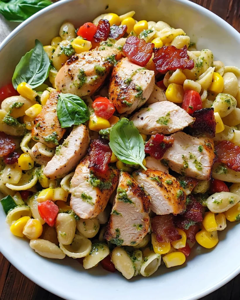 A delicious Chicken and Corn Pasta Salad with Bacon that combines tender chicken, sweet corn, and crispy bacon for a flavorful dish.