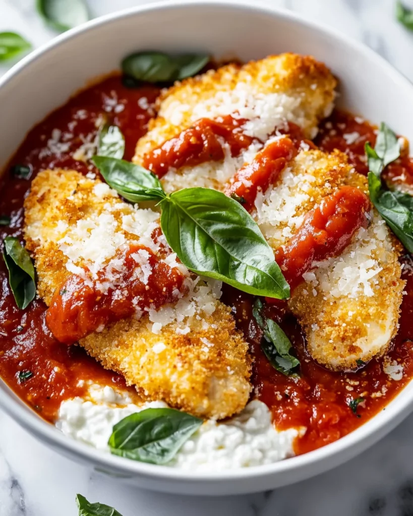 All that’s left is the finishing touch! Carefully place a few fresh basil leaves on top to brighten up your Chicken Parm Cottage Cheese Bowl. Their vibrant color adds a lovely pop, and the aroma is simply irresistible. Serve immediately while it’s warm and gooey. You can pair this with a fresh side salad or some crusty bread for a complete meal. Enjoy your culinary creation with family or friends, and get ready for the compliments to roll in!