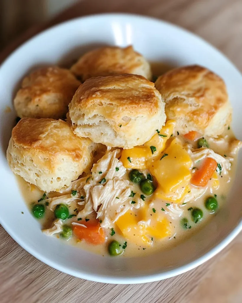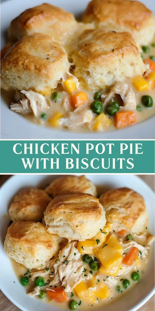 Making Chicken Pot Pie with Biscuits is more than just cooking; it’s about creating memories around the dinner table. The aroma wafting through your home will draw your family in, sparking conversations and laughter. Each bite is a warm embrace, reminding us of cozy nights and shared stories. This dish is not only easy to prepare but also brings a sense of comfort that busy lives often overlook. So, whether it’s a weeknight dinner or a special gathering, this recipe is sure to bring joy and satisfaction to your table. Happy cooking!
