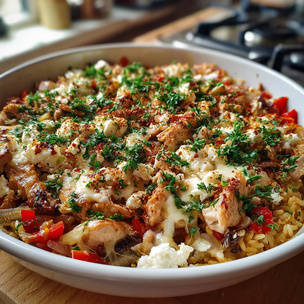 A creamy and savory Chicken Rice Feta Casserole that’s perfect for a comforting meal.