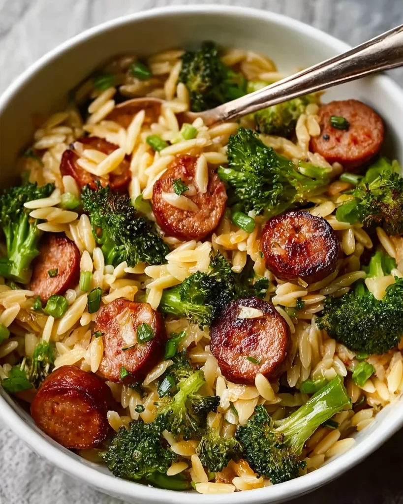 A delicious and easy one-pot meal featuring chicken sausage, broccoli, and orzo pasta.