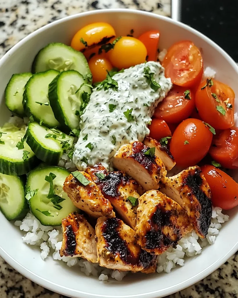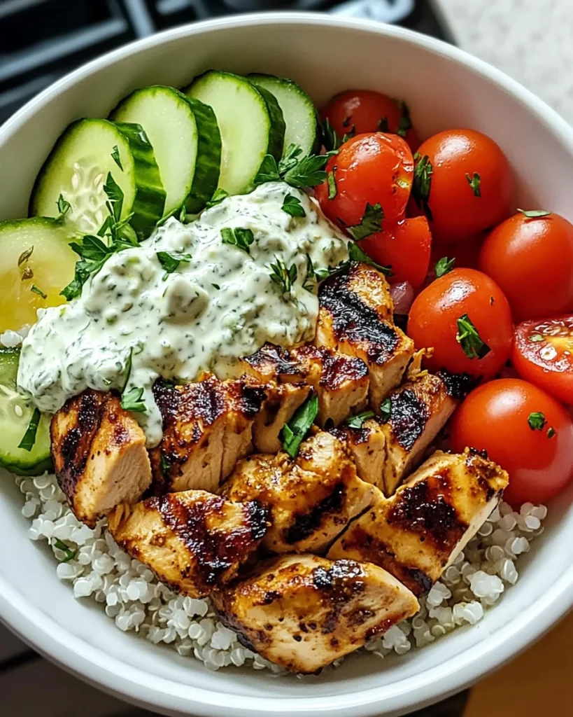 A delicious chicken tzatziki bowl that combines marinated grilled chicken with fresh vegetables and a creamy tzatziki sauce, perfect for a healthy meal.