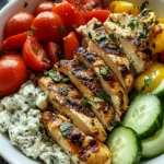 - Assemble Bowls: Start with a base of quinoa or rice. Add grilled chicken, cherry tomatoes, cucumbers, red onion, olives, and feta cheese. Drizzle tzatziki sauce over the top and garnish with parsley.