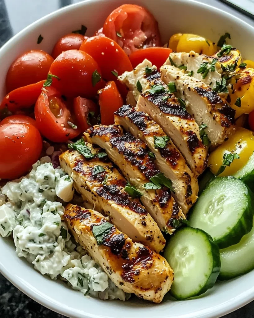 A delicious chicken tzatziki bowl that combines marinated grilled chicken with fresh vegetables and a creamy tzatziki sauce, perfect for a healthy meal.