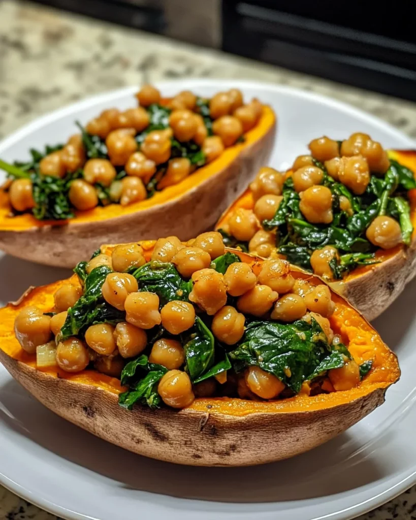 A delicious and healthy dish featuring sweet potatoes stuffed with chickpeas and fresh spinach.