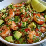 Chilli Lime Shrimp Ceviche is a refreshing seafood dish that combines marinated shrimp with zesty lime juice, fresh vegetables, and vibrant flavors.