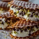 Grab your pizzelle cookies for assembly! Take one pizzelle and spoon a generous dollop of your creamy filling onto the flat side. Be careful not to overfill, as it might squish out when you add the top cookie. Sprinkle a few chopped pistachios on the filling for a little crunch and color. Finally, take another pizzelle, gently press it on top, and voilà—a sandwich is born! Repeat this process until all your delicious fillings are used up. Your kitchen is going to smell heavenly!