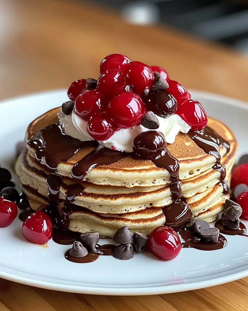 Now for the fun part! Stack those fluffy pancakes high and top them with cherry pie filling, mini chocolate chips, a drizzle of chocolate syrup, and a generous dollop of whipped cream. If you set aside some cherries, toss them on top for that extra flair. Serve your Chocolate Cherry Pancakes immediately for a breakfast that’s sure to impress everyone at the table!