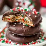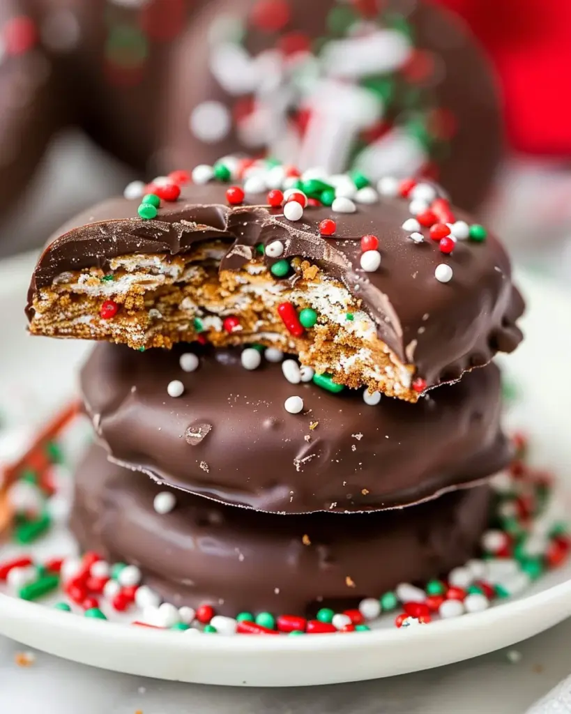 Grab a fork and dip each stack into the melted chocolate. Make sure they’re completely coated, then lift them out, letting any excess chocolate drip off. If you want to add sprinkles, now’s the time! Sprinkle them on while the chocolate is still wet for a fun, festive touch.